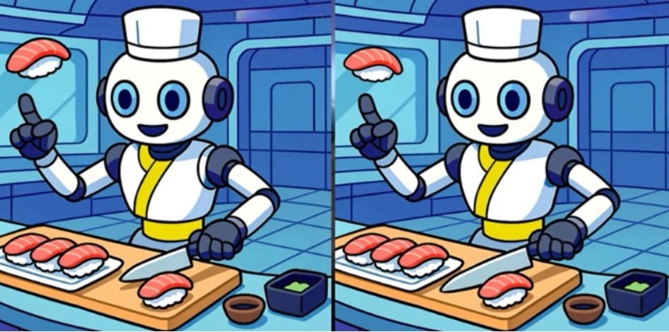 Pateiktose nuotraukose pavaizduotas sušių vyras robotas. Iš pirmo žvilgsnio abu piešiniai atrodo visiškai vienodai, tačiau tarp jų slypi trys nedideli skirtumai.
