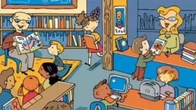 Nuotraukoje matome biblioteką su daugybe vaikų. Vieni ieško knygų, kurias norėtų perskaityti, kiti sėdi prie kompiuterių ar bendrauja tarpusavyje.