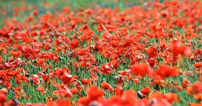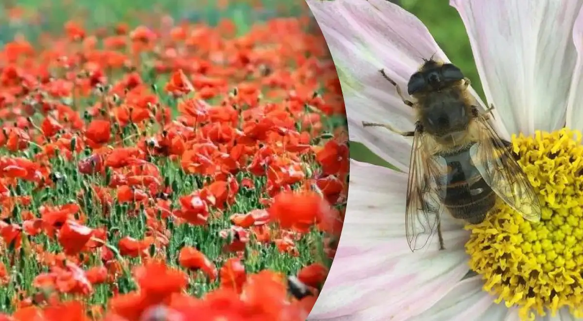 Nuotraukoje matome lauką su aguonomis. Gėlės dengia lauką kaip stora raudonai žalia antklodė, ir pabaigos nematyti. Atrodytų, šio gėlių grožio beribiškumo netrikdė nė vienas gyvūnas. Bet taip nėra – kažkur tarp gėlių slepiasi bitė, kurią pastebėti bus labai sunku.