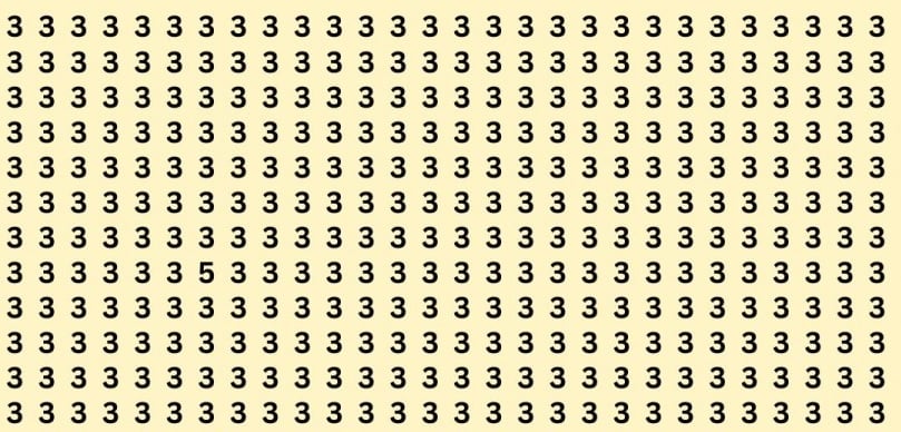 Paveikslėlyje matome daugybę skaičių 3, kurie yra išdėstyti eilėmis ir stulpeliais. Iš pirmo žvilgsnio atrodo, kad tarp jų nėra išskirtinių skaičių, tačiau iš tikrųjų taip nėra. Kažkur nepastebimai pasislėpę penki, kuriuos rasti nebus lengva.